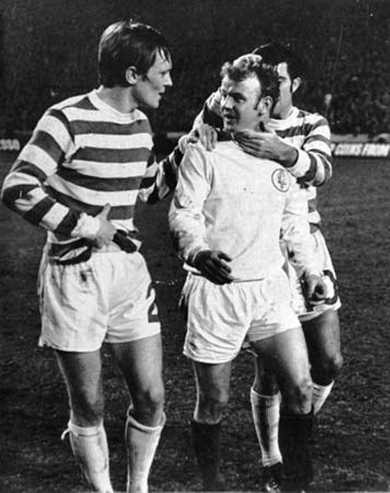 Some say Leeds lost their nerve in front of this vast opposition something Billy Bremner totally disagreed with. “Nonsense, we played in front of big crowds before. Granted nothing as big as this but for me personally if anything it was Bertie Auld who took my mind off the game and affected my concentration Bertie could be as nasty as any of the hard men in United’s ranks, after 42 minutes Jones was carried off with a deep gash on his right shin for a time there were fears he would not return. Bremner recalled: “It was a terrible, terrible tackle on Mick Jones by wee Bertie Auld. His leg was in a terrible state at half-time I was raging when I saw it well, I went after Bertie at every opportunity in the second half he knew I was after him but no chance, he was too fly for me. Tam McViegh used to say Bertie was that fly he could walk on the ceiling.