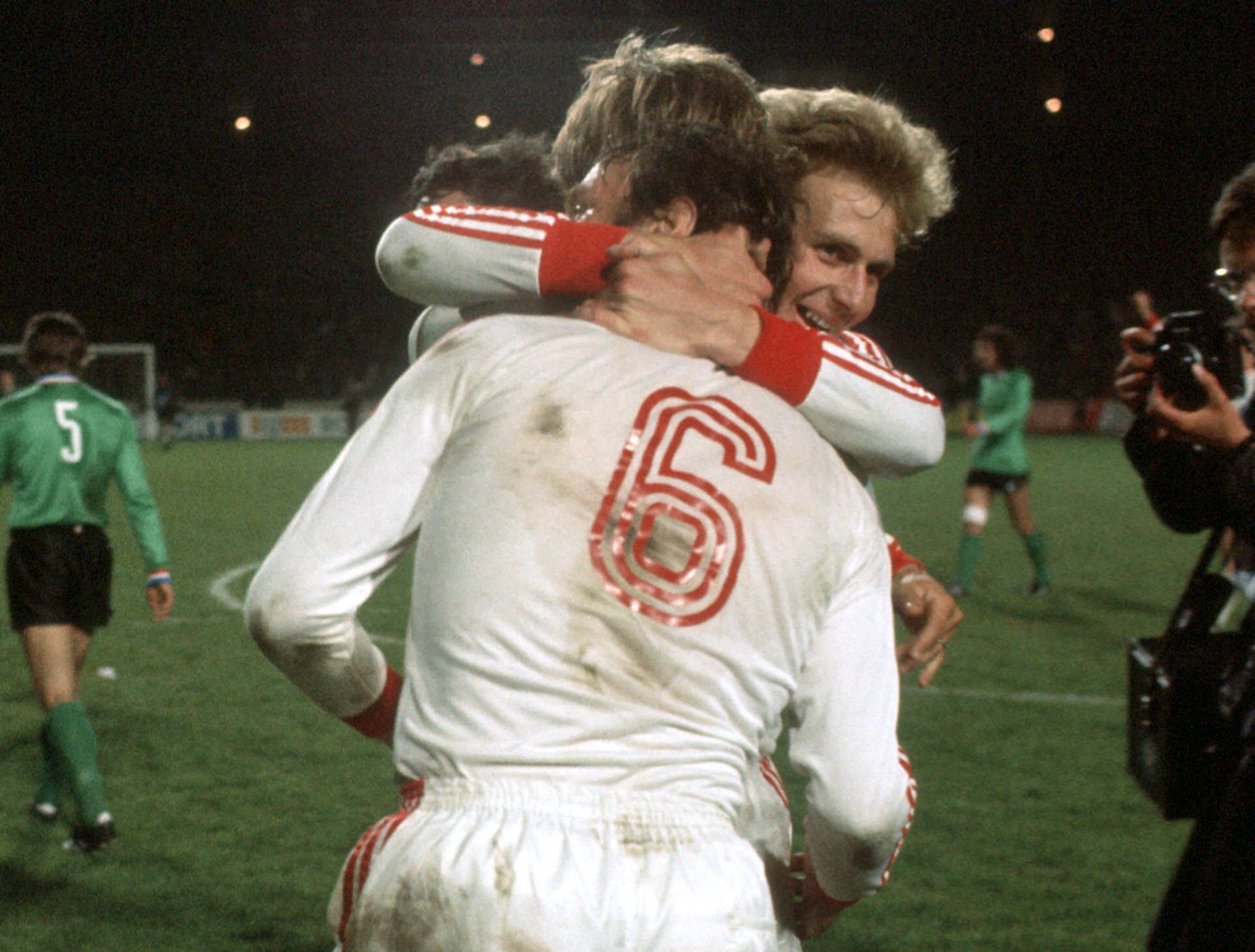 Schlussjubel Bayern, u.a. Karl-Heinz Rummenigge re. und Franz Roth vorn