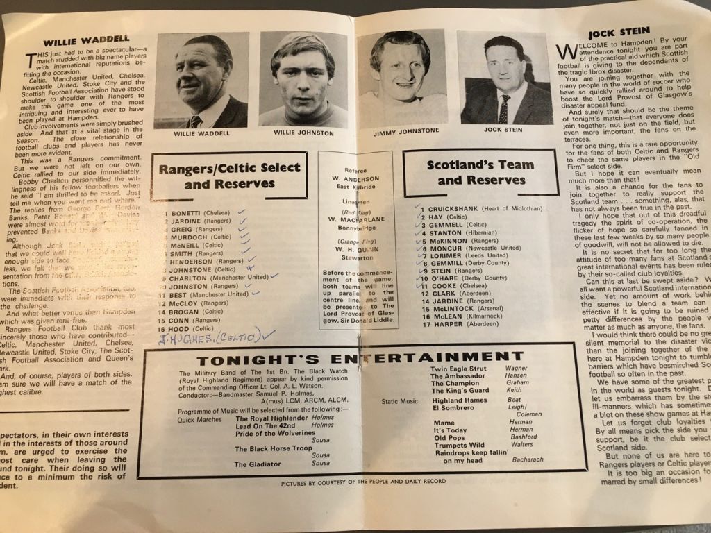 My dad had decided, for his own reasons, that he was not going back to Ibrox, and as I was still considered in the ‘too wee’ category for such games, we were paying his brother a visit at his home in Barmulloch, as we did at New Year. Both men had teenage sons at the game, albeit not together, so when word came through of “trouble at Ibrox,” there was genuine concern for their safety. Eventually, my cousin would arrive home, saying he had heard there had been “bother” at the other end, like most folk, I guess, assuming violence rather than the tragedy which later unfolded. I can recall watching the scenes on black-and-white television later that night – not sure if it was Scotsport or the news – then in the newspapers, bodies laid out on the Ibrox pitch and the expressions of Jock Stein, Neil Mochan, Bob Rooney and other club officials as they tended to the injured, with the thick fog and lack of colour only adding to the surreal scenario.