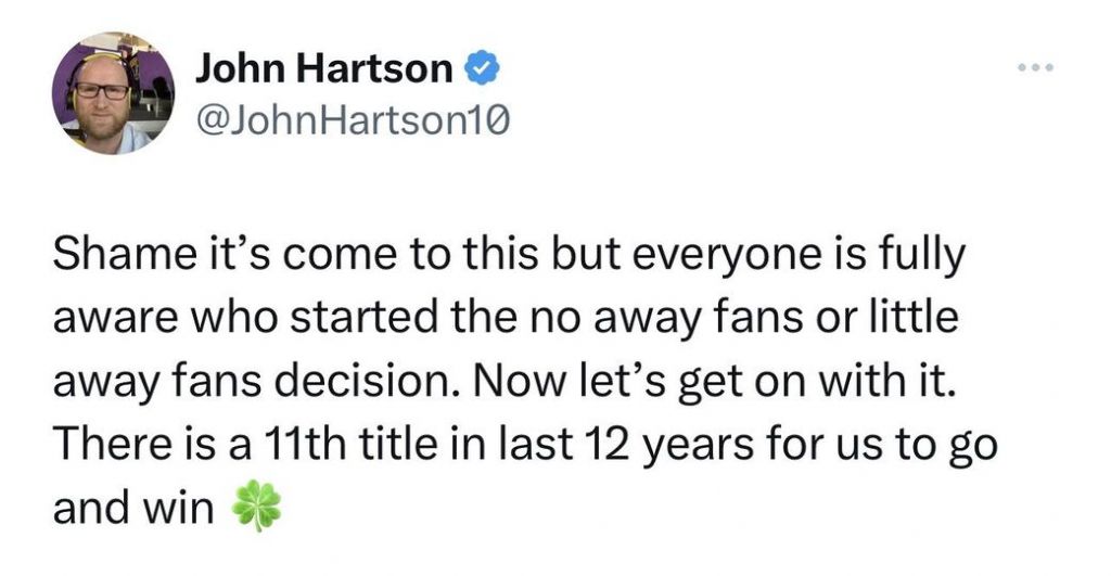 Here’s John Hartson’s take on the yesterday’s news that Celtic have refused tickets for the corner at Ibrox and as a result there will be no fans of theRangers at Celtic Park on Saturday 8 April. He is perfectly correct on both points – although the waters will be muddied as usual on where the blame lies – and of course Celtic are on course for our 11th title in 12 seasons with Celtic only missing out when the team had no supporters in the stadiums due to a global pandemic that tends to come along round about once every century. If that’s a trend for their league success most of us can live with that.