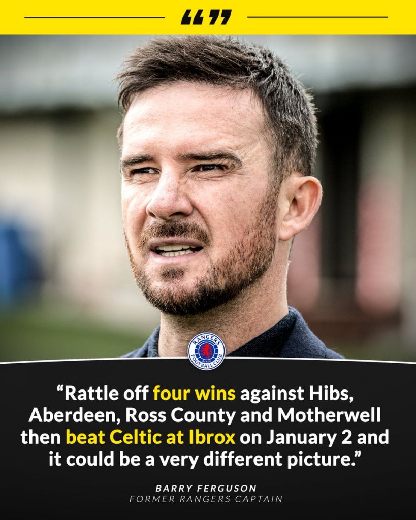 Barry Ferguson has previously explained how easy it is going to be. They’ll just win all their games ahead of Celtic visiting Ibrox on 2 January and of course Celtic are almost inevitably going to drop points ahead of that Glasgow Derby.