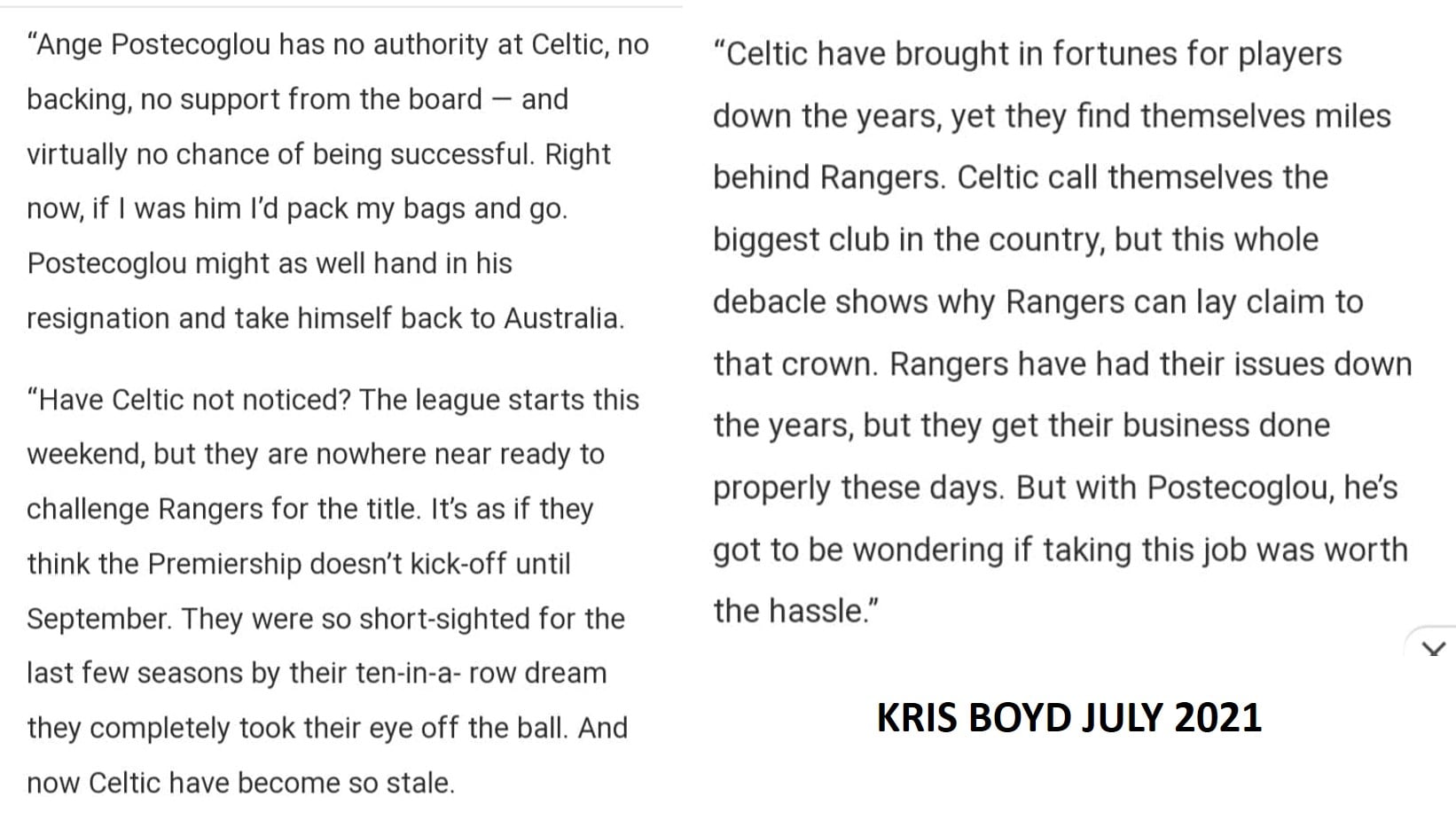 When we appointed Ange Postecoglou they were even more convinced. A fan base who love a glitzy name could do nothing but laugh at Celtic shopping in the ‘bargain basement’ for some ‘unheard of’ Australian. When the manager cleared the decks and brought in twelve new recruits they laughed at Celtic ‘wasting’ money on the likes of Kyogo. A diminutive, unheard of striker like him would never cut the mustard in Scotland. They were convinced they would canter to the league once more. Here’s the Ibrox mouth-piece Kris Boyd commenting last July on Ange Postecoglou being appointed Celtic manager.