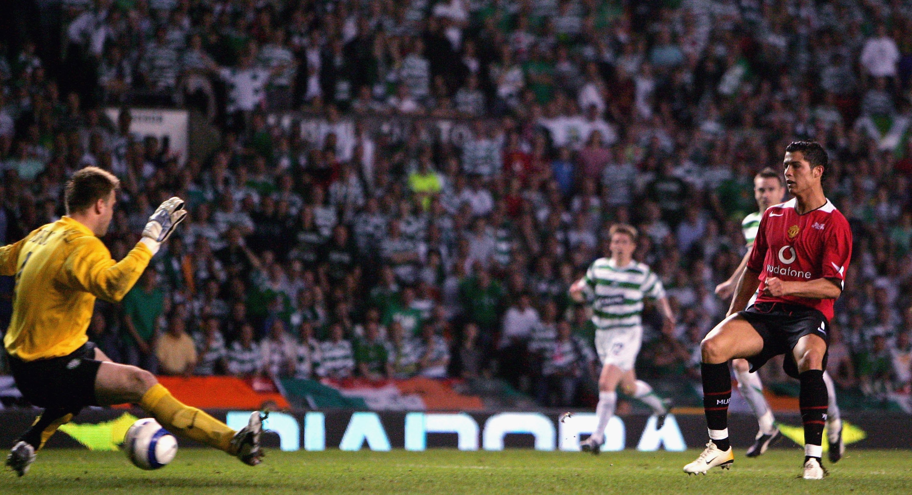 MANCHESTER, UNITED KINGDOM – MAY 09: Cristiano Ronaldo of Manchester United scores past Artur Boruc of Celtic during the Roy Keane Testimonial match between Manchester United and Celtic at Old Trafford on May 9, 2006 in Manchester, England. (Photo by Laurence Griffiths/Getty Images)
