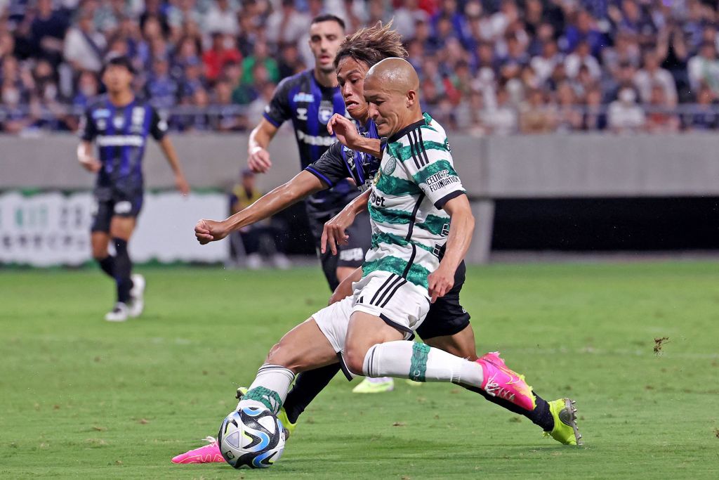 Celtic’s forward Daizen Maeda (R) and Gamba Osaka’s Hideki Ishige (2R) fight for the ball during a friendly football match between Japan’s Gamba Osaka and Scotland’s Celtic at Suita City Stadium in the city of Suita, Osaka prefecture on July 22, 2023. (Photo by PAUL MILLER/AFP via Getty Images)