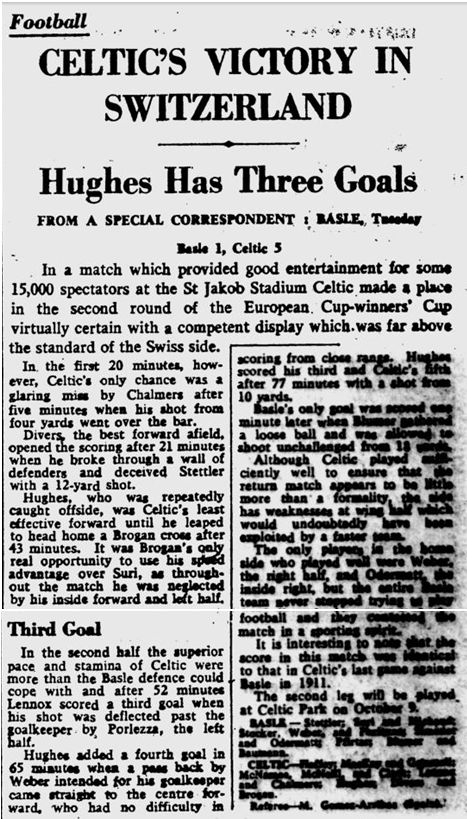 In 1963, Celtic entered the Cup-Winners’ Cup. In the opening tie of the round, the Bhoys hammered Swiss team Basel 5-1. This included Hughes scoring Celtic’s first ever European hat-trick. This was one of ten hat-tricks that he scored across his entire Celtic career.