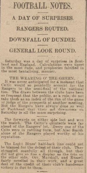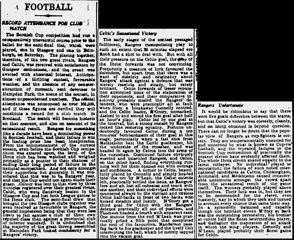 There are happier semi-finals as well. 1925 saw the mesmeric Patsy Gallacher at his best, as Celtic delivered a 5-0 thrashing to Rangers with 2 goals from Jimmy McGrory, 2 from Adam McLean and one from Alec Thomson. It was a triumph that was as comprehensive as it was unexpected in front of the first six-figure crowd for a game in Scotland other than the Scotland v England international.