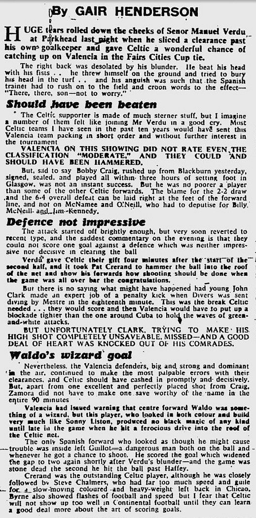 Nevertheless, the third-place League finish enabled participation in Europe for the first time, with a slot in the Inter-Cities Fairs Cup, where the rookie Celts were given the stiffest-possible test, drawn against holders Valencia, in the First Round.
