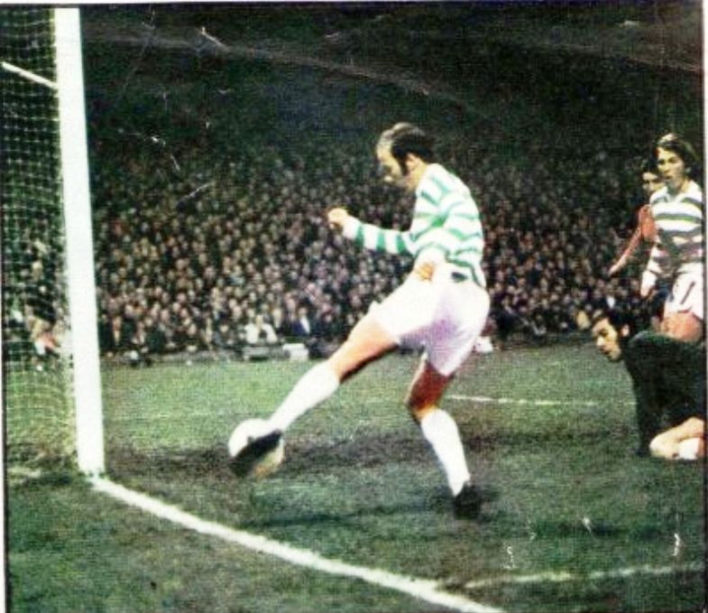Early in the match Harry Hood cuts the ball back from the touchline for Kenny Dalglish to score but unbelievably the goal was ruled out as the badly positioned linesman reckoned the ball was out of play.