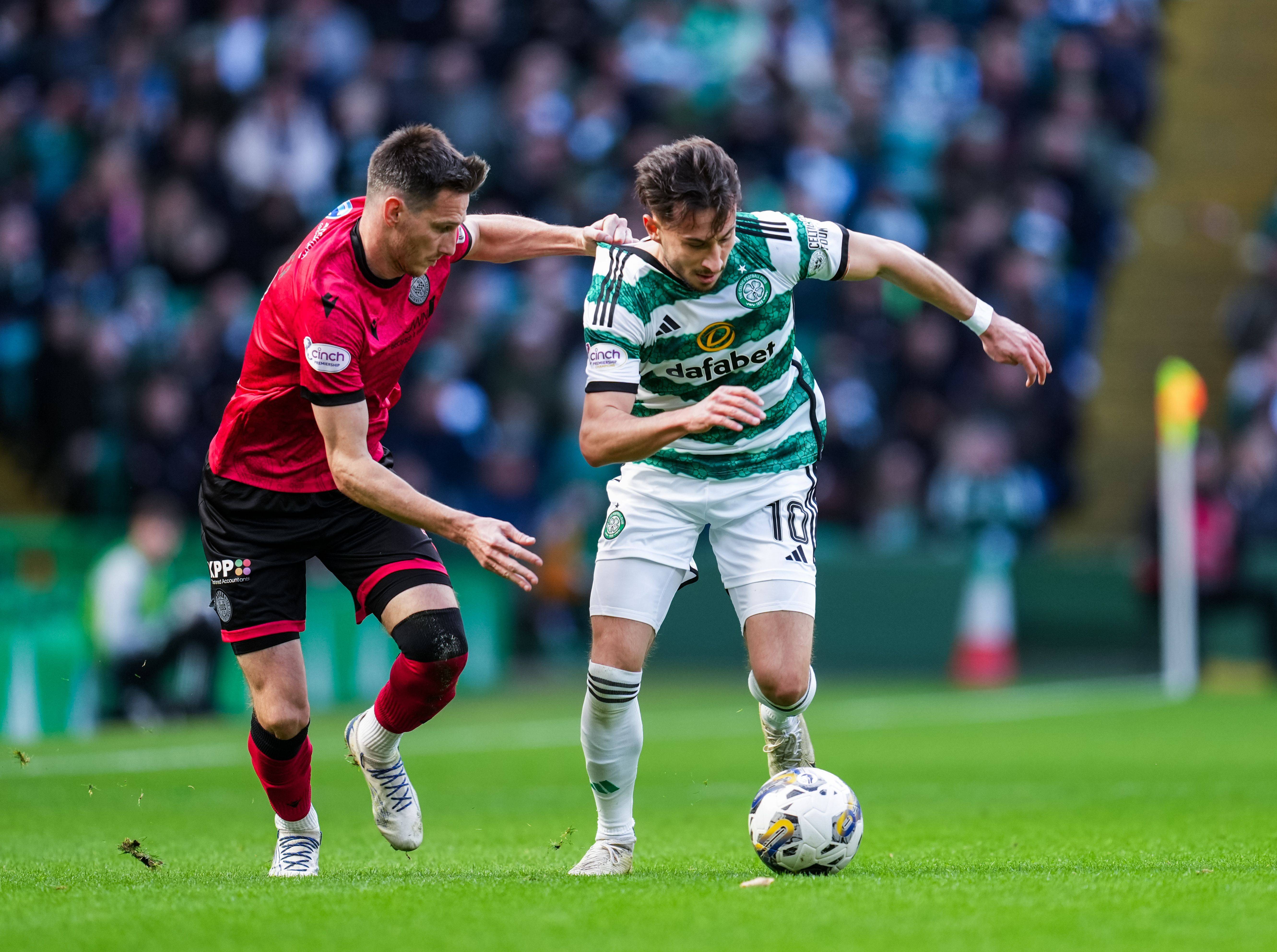 Scott Tanser challenges Nicolas Kuhn. Celtic v St Mirren, Scottish Premiership, , Celtic Park, – 13 April 2024. Photo Stuart Wallace/Shutterstock