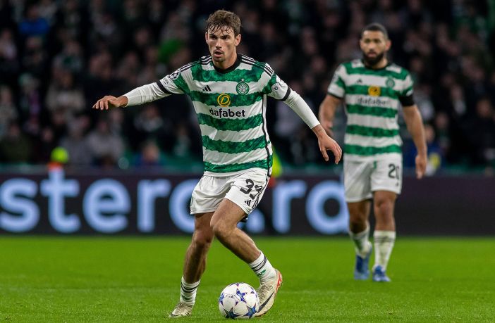 Celtic v Atletico Madrid – Matt O Riley crosses the ball during the UEFA Champions League match at Celtic Park, on Wednesday October 25, 2023. Photo Andrew Milligan