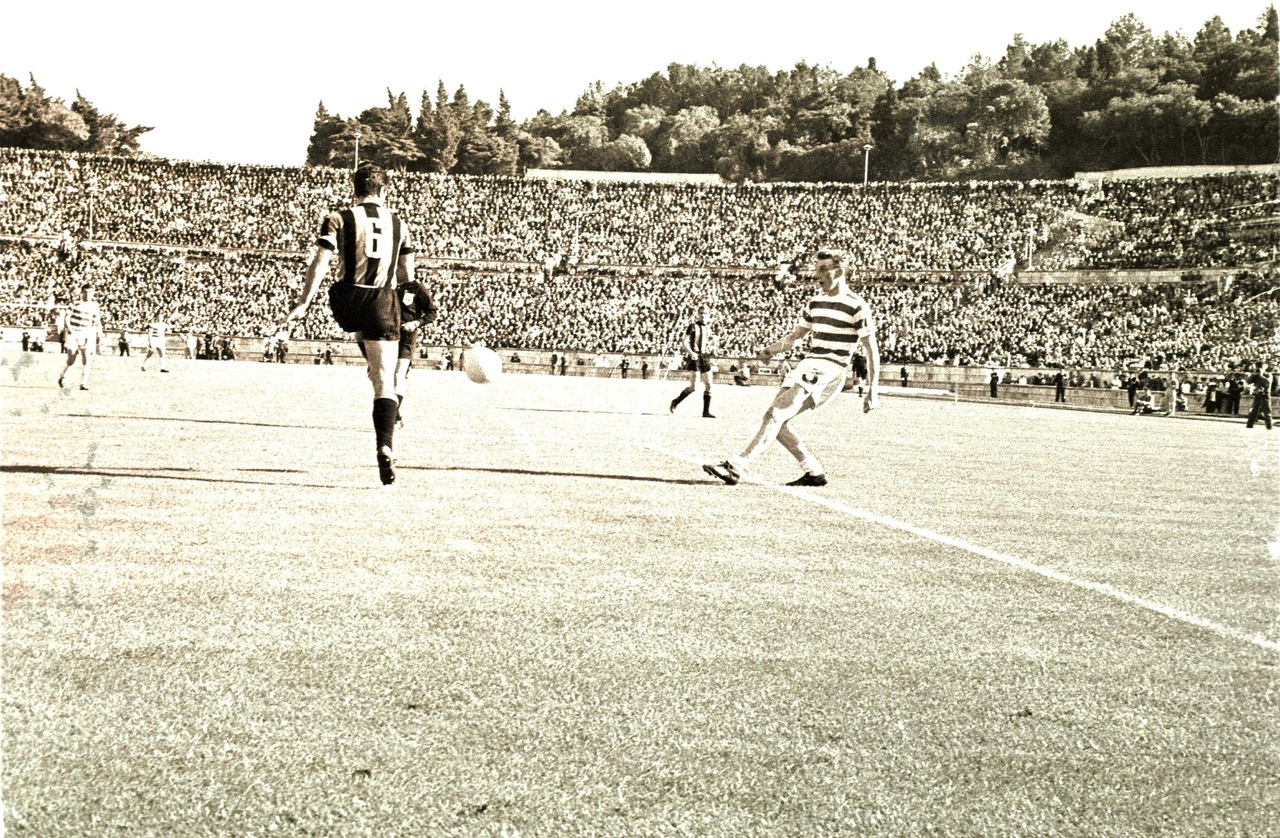 Celtic continually moved forward and ground their opponents down, attack followed attack until in the second half “The Big Shot” fired a blistering cannonball into Sarti’s goal as only Tommy Gemmell could.