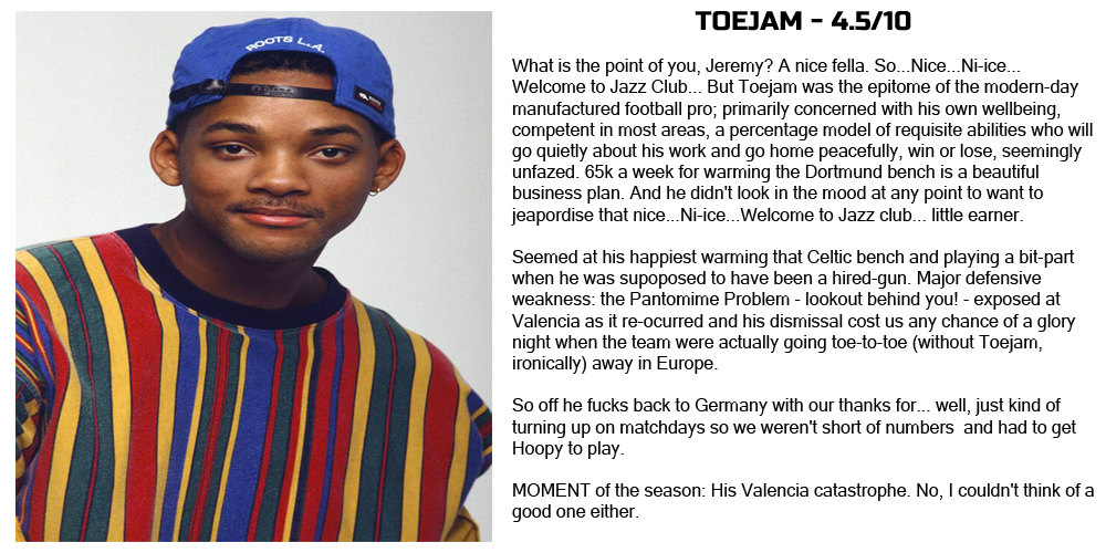 That leaves us with Jerry Toljan the right back who took a considerable pay-cut to come to Scotland and increasingly looked like a bored schoolboy looking at the clock waiting for the bell to ring. He too got some time at Ibrox in the Dead Rubber match but was as apathetic as just about any player who has ever worn the Celtic jersey.