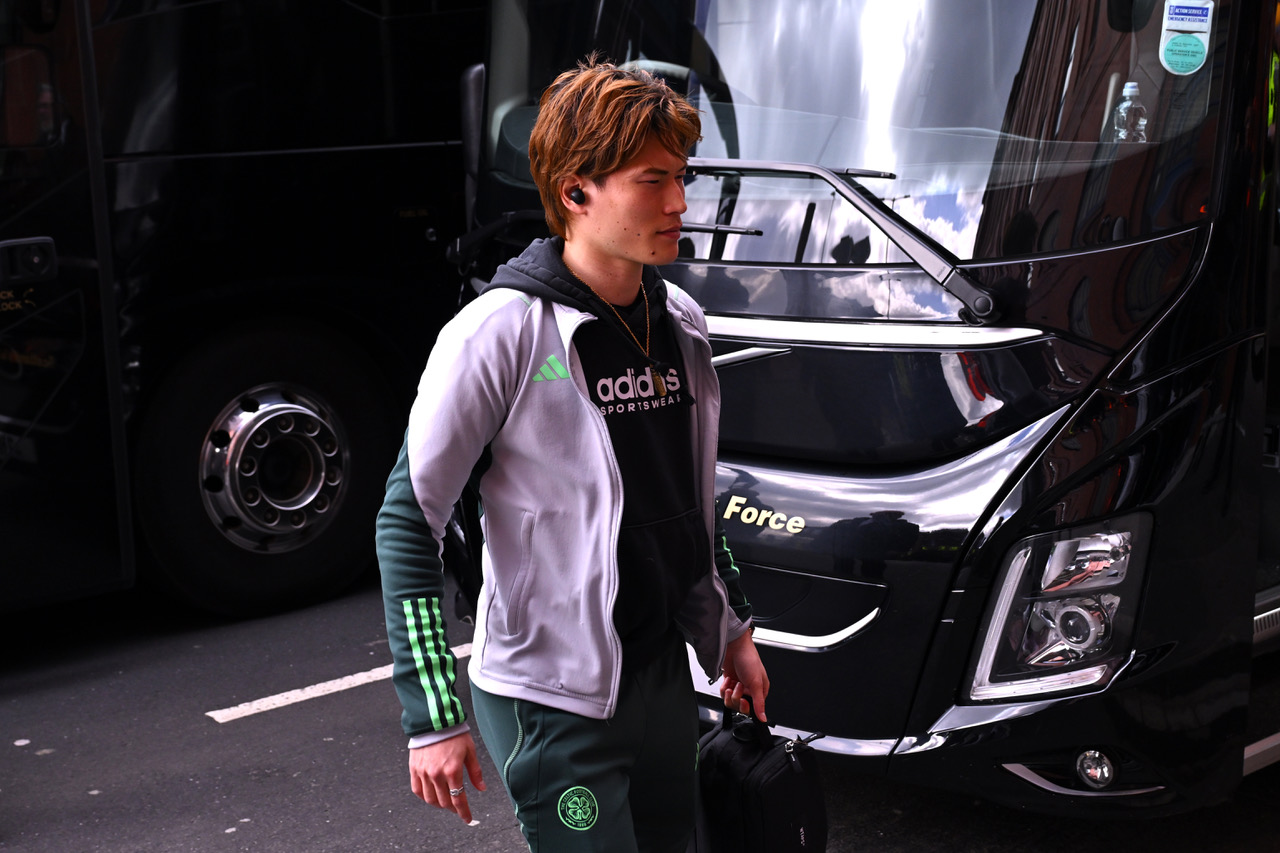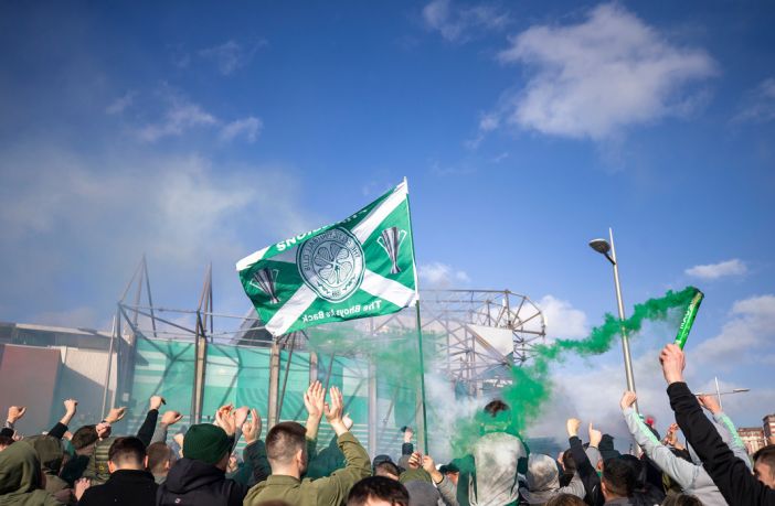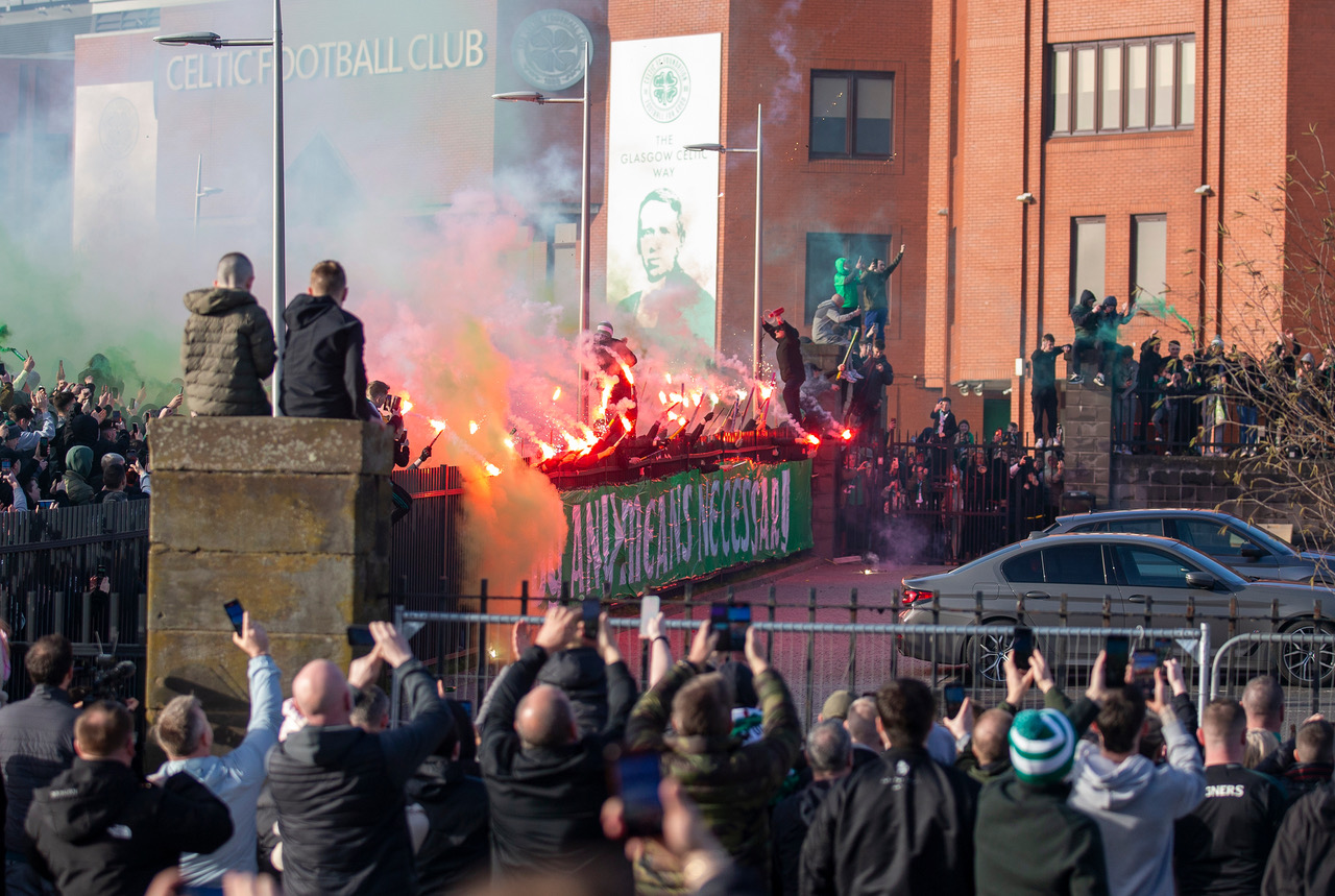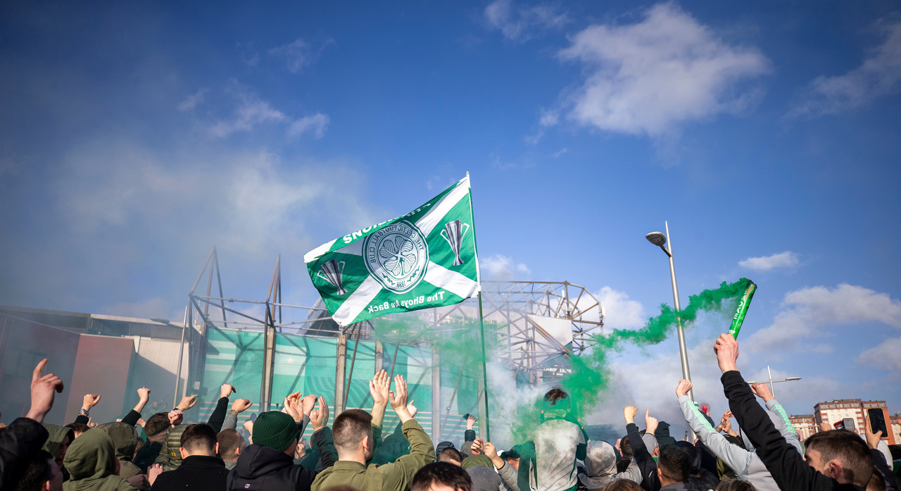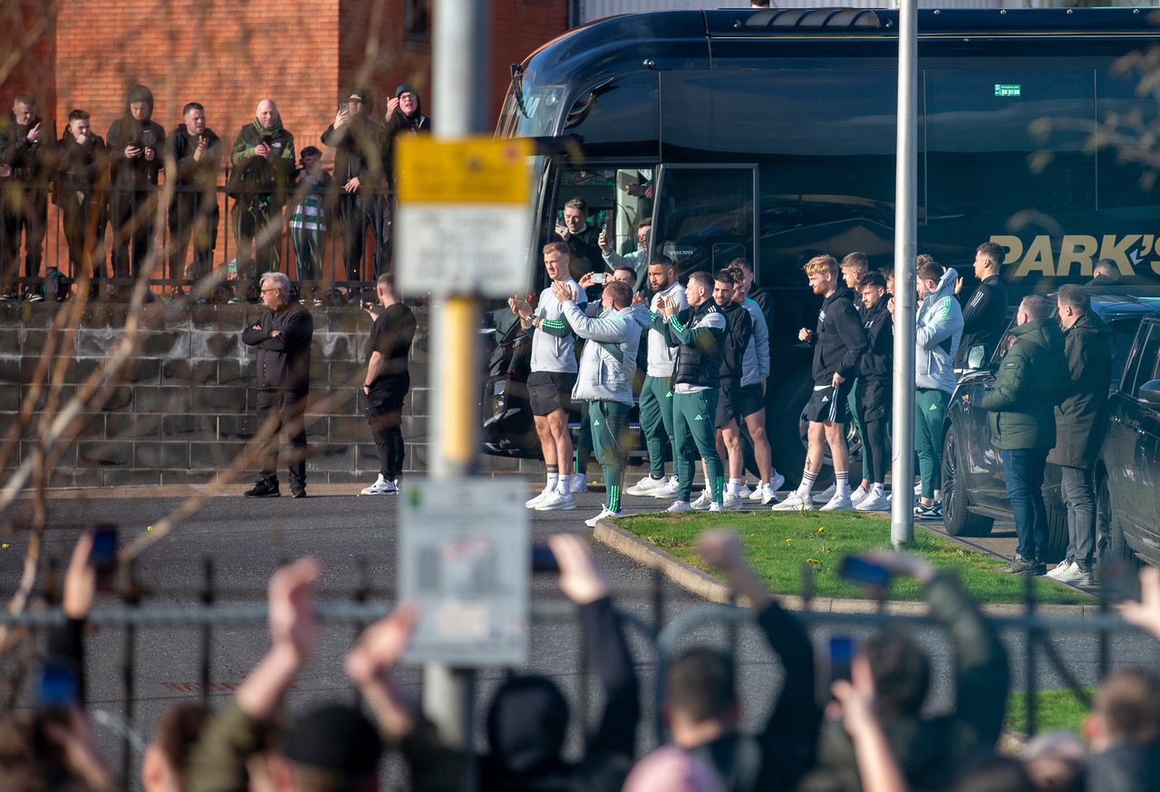 Celtic supporters gathered outside the stadium of Saturday afternoon at the invitation of the two Celtic ultras groups, the Green Brigade and Bhoys Celtic to give the players a colourful, loud and crucial send-off as they headed to their pre-match hotel ahead of Sunday’s visit to Ibrox.