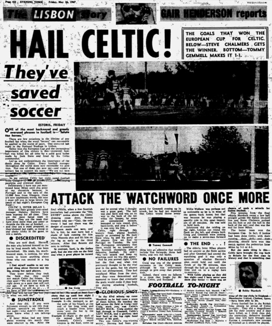 *You could only take a small amount of currency out of the UK in 1967 and many Celtic fans were caught short, mostly due to their expenditure in the bars and cafes of Lisbon!