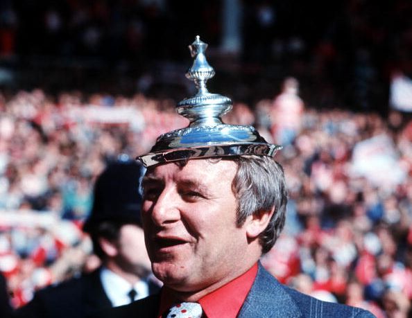 Lifting the FA Cup in 1977 as manager of Manchester Utd