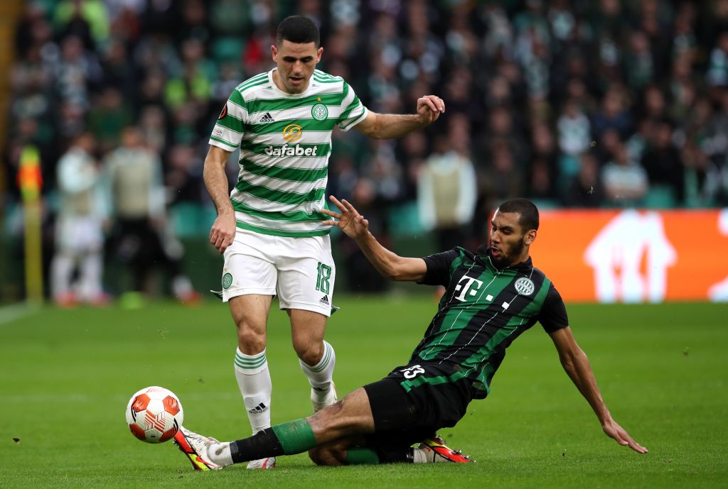 Tom Rogic is challenged by Aissa Laidouni of Ferencvaros TC during the UEFA Europa League group G match between at Celtic Park on October 19, 2021. (Photo by Ian MacNicol/Getty Images)