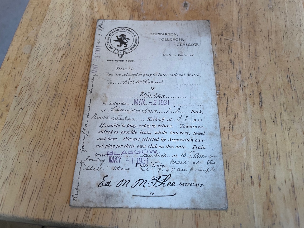 Bobby’s son still has the handwritten postcard invitation for his dad’s third and final outing for Scotland Juniors, which took place at Llandudno on Saturday, 2 May 1931, eight days before his 17th birthday. It is signed by SJFA Secretary Ed M McPhee of Stewarton, Tollcross, Glasgow and advises that the train would leave Glasgow Central at 10.05am on Friday, 1 May 1931, with players requested to be at the ‘Shell in the station at 9.45am prompt.’ The return journey from Llandudno would then commence at 9.05pm on the Saturday.