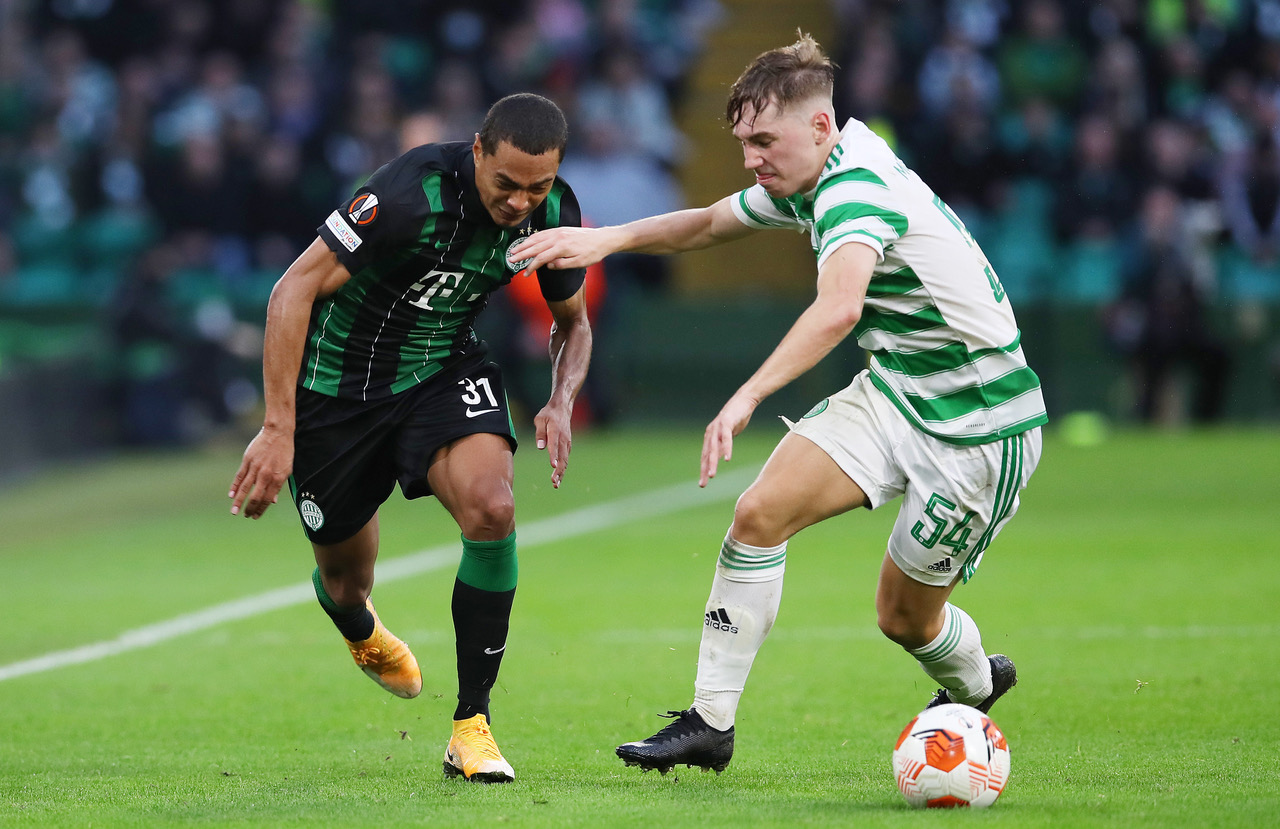 Henry Wingo of Ferencvaros TC battles for possession with Adam Montgomery of Celtic during the Europa League group G match between Celtic FC and Ferencvarosi TC on 19 October, 2021. (Photo by Ian MacNicol/Getty Images)
