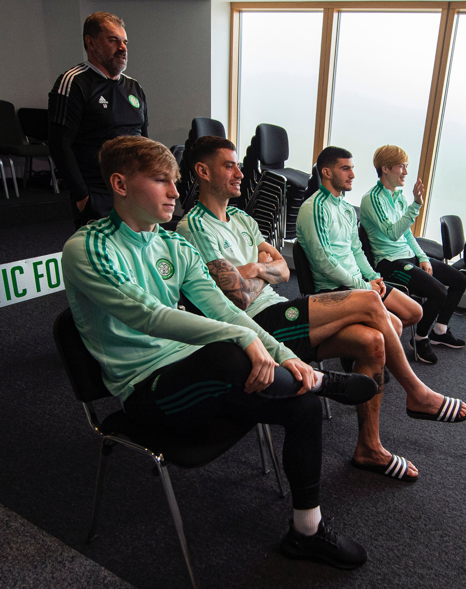 Celtic’s Adam Montgomery, Nir Bitton, Liel Abada, kyogo Furuhashi and Ange Postecoglu during a Celtic Zoom call to Children who are in hospital or severly not well at Lennoxtown training compound, on December 13, 2021,(Photo by Ross MacDonald / SNS Group)