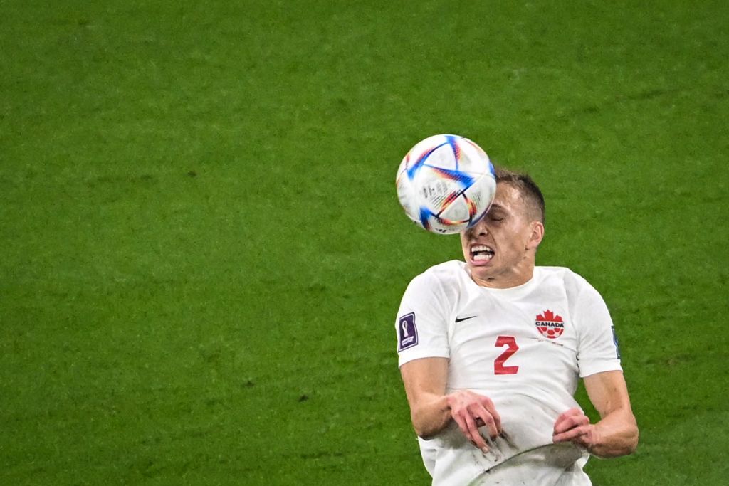 Canada’s defender #02 Alistair Johnston controls the ball during the Qatar 2022 World Cup Group F football match between Belgium and Canada at the Ahmad Bin Ali Stadium in Al-Rayyan, west of Doha on November 23, 2022. (Photo by PATRICK T. FALLON/AFP via Getty Images)