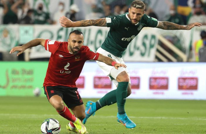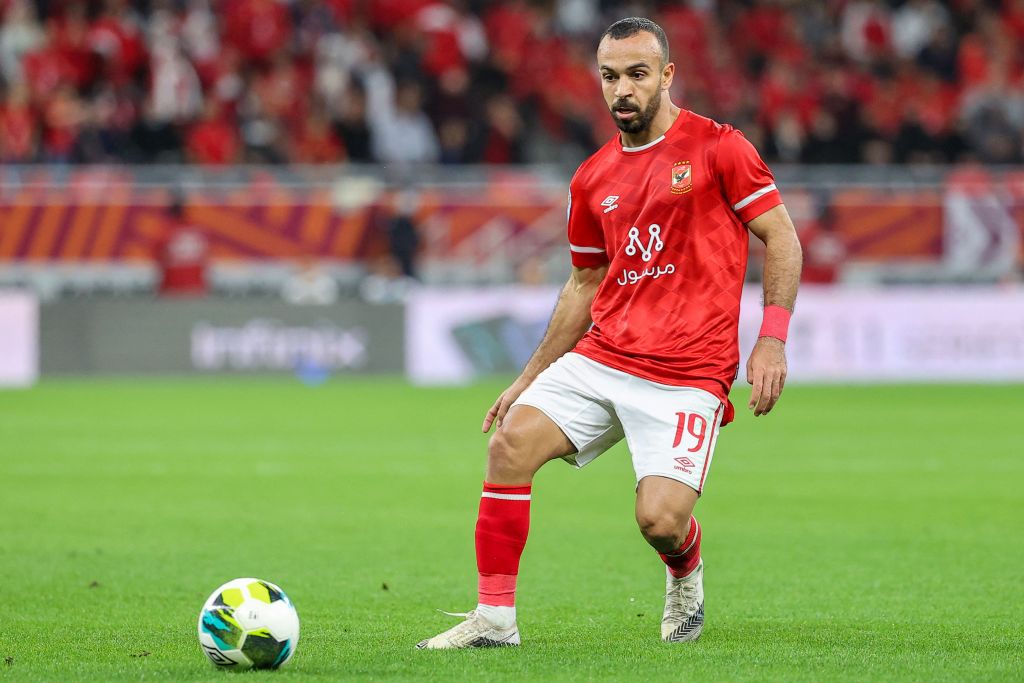 Ahly’s midfielder Mohamed Magdy controls the ball during the CAF Super Cup football match between Egypt’s Al-Ahly and Morocco’s Raja Club Athletic (Raja Casablanca) at the Ahmad Bin Ali Stadium in the Qatari city of Ar-Rayyan on December 22, 2021. (Photo by KARIM JAAFAR / AFP) (Photo by KARIM JAAFAR/AFP via Getty Images)