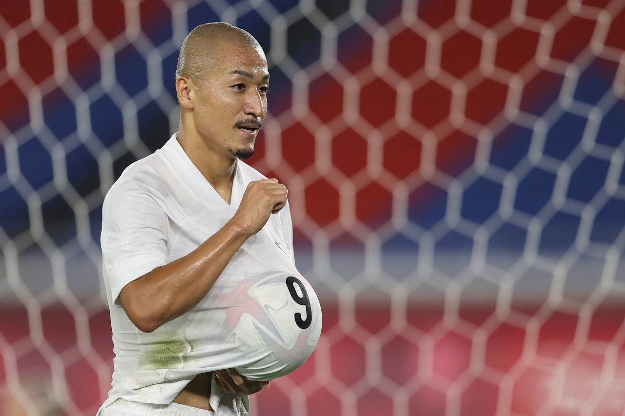Daizen Maeda #9 of Team Japan celebrates after scoring their side’s fourth goal during the Men’s Group A match between France and Japan on day five of the Tokyo 2020 Olympic Games at International Stadium Yokohama on July 28, 2021 in Yokohama, Kanagawa, Japan. (Photo by Francois Nel/Getty Images)
