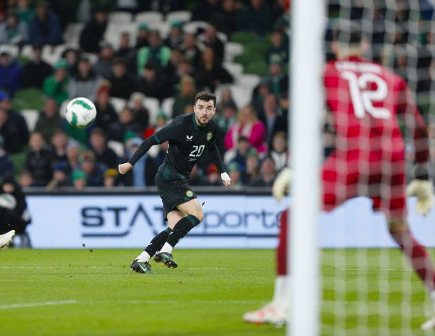 21st November 2023 Aviva Stadium, Dublin,I Republic of Ireland v New Zealand. Mikey Johnston with the cross in front of the New Zealand goal. Photo ActionPlus Peter Fitzpatrick