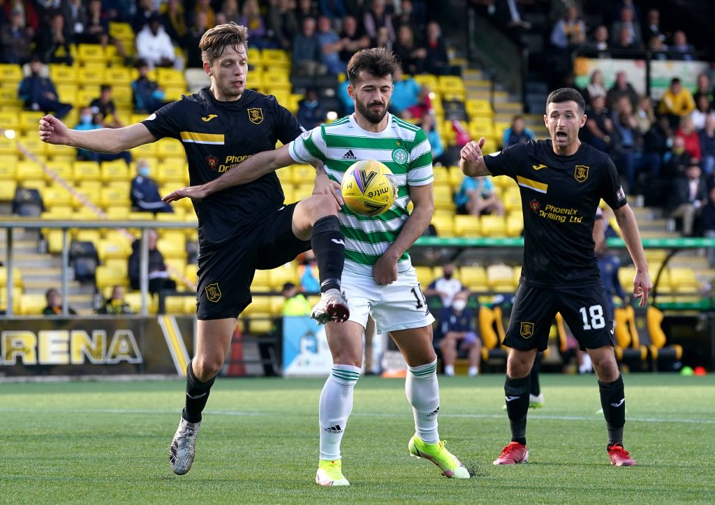 Albian Ajeti centre in action during the cinch Premiership match at the Tony Macaroni Arena, Livingston. Sunday September 19, 2021. Photo: Andrew Milligan