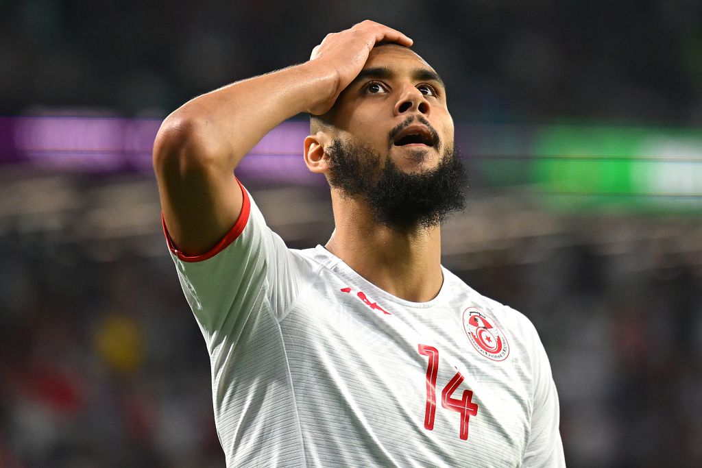 Aissa Laidouni of Tunisia reacts after a missed chance during the FIFA World Cup Qatar 2022 Group D match between Tunisia and France at Education City Stadium on November 30, 2022 in Al Rayyan, Qatar. (Photo by Clive Mason/Getty Images)