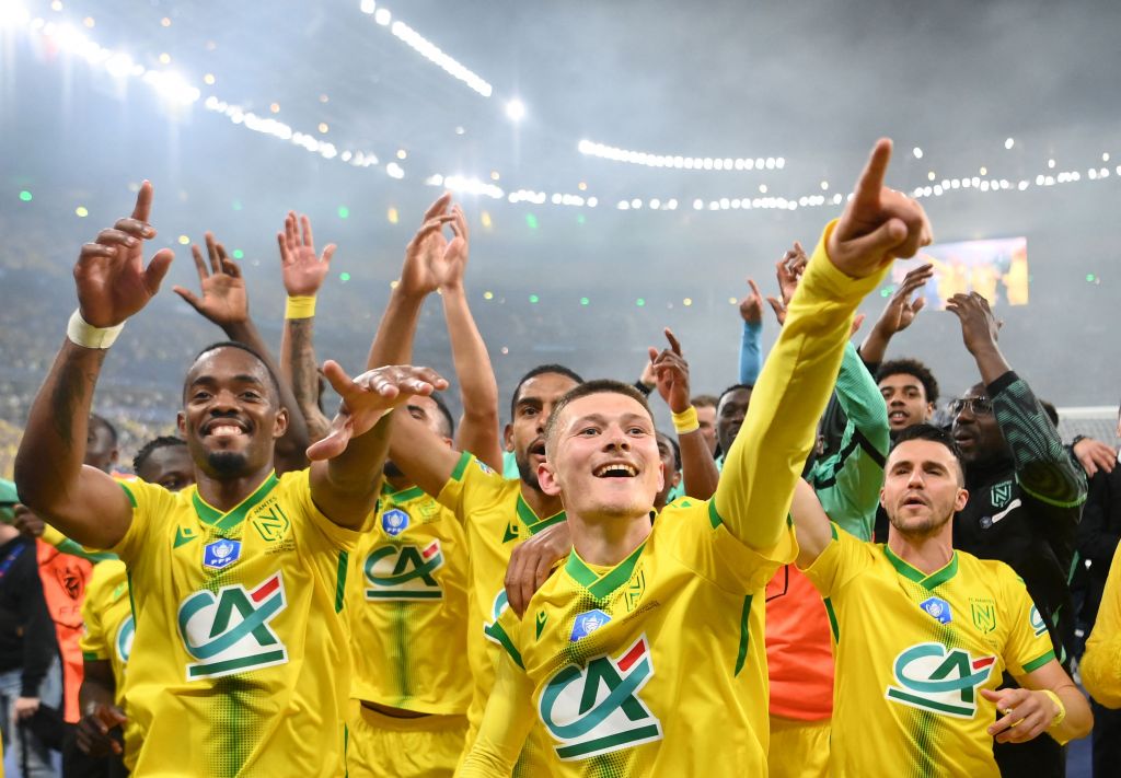 Nantes’ French midfielder Quentin Merlin (C) and Nantes’ players celebrate during the trophy ceremony at the end the French Cup final football match between OGC Nice and FC Nantes at the Stade de France, in Saint-Denis, on the outskirts of Paris, on May 7, 2022. (Photo by FRANCK FIFE/AFP via Getty Images)