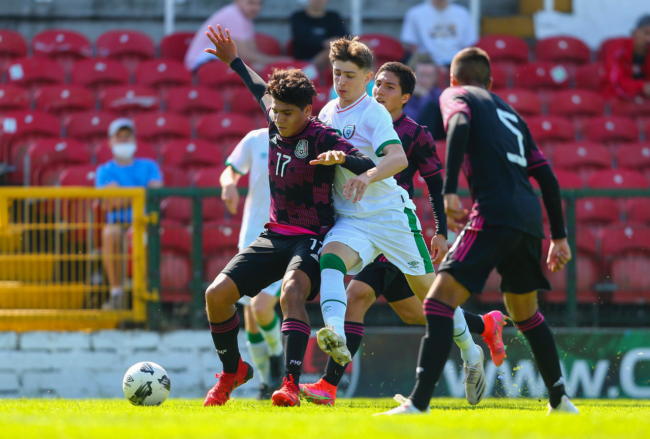 Under 17 International Friendly, Länderspiel, Nationalmannschaft Turner s Cross, Cork 7/9/2021 Republic of Ireland U17, U 17 vs Mexico U17 Mexico’s Oscar Soto with Ireland’s Rocco Vata. Photo Ken Sutton