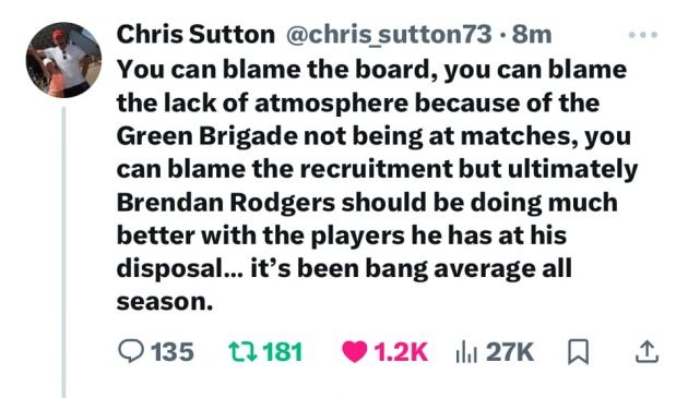 As for the players, they also need to look at themselves in the mirror. They won a treble last year and currently look like a side battling for a place in the top six. They need to get out of the rut they are in and start performing or they can kiss goodbye to defending the title Celtic won the last two seasons. Have they got the stomach for it?