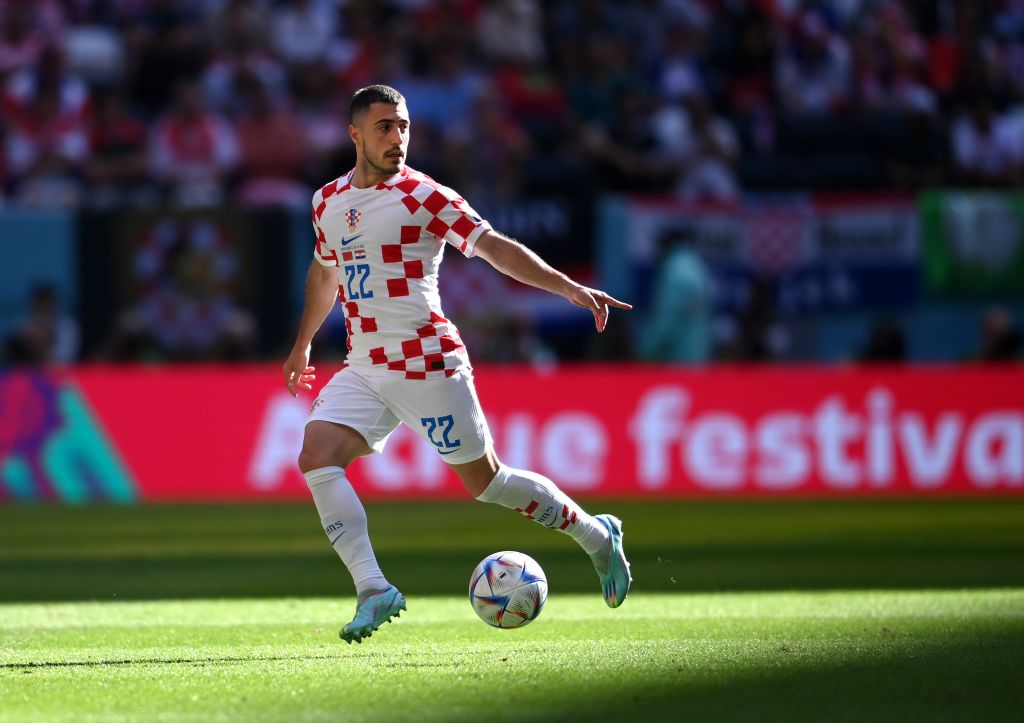 Josip Juranovic of Croatia runs with the ball during the FIFA World Cup Qatar 2022 Group F match between Morocco and Croatia at Al Bayt Stadium on November 23, 2022 in Al Khor, Qatar. (Photo by Laurence Griffiths/Getty Images)