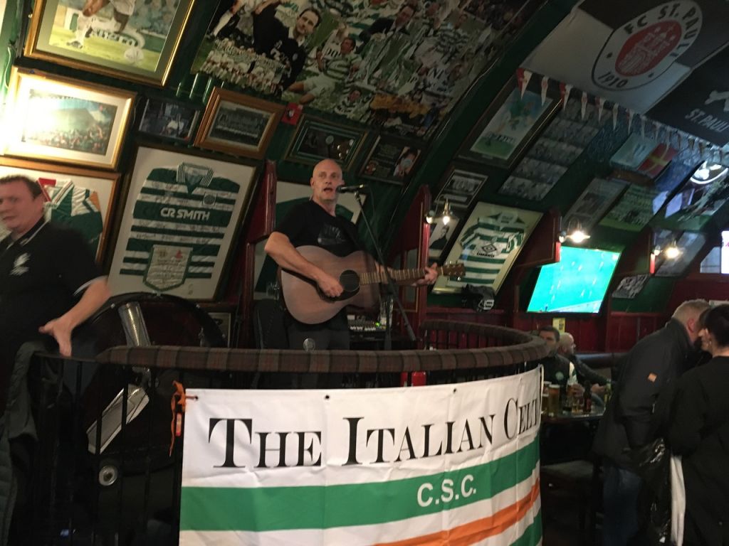 During a brief interlude from the entertainment provided by an excellent musician, the boys and girls from the Italian Celts take over with a wonderful rendition of ‘Bella Ciao’ in the middle of the packed pub, which I desperately try to capture on my mobile phone. Other folk quickly gather round to join in. It’s like a scene from a movie. An Italian Job in the Gorbals.