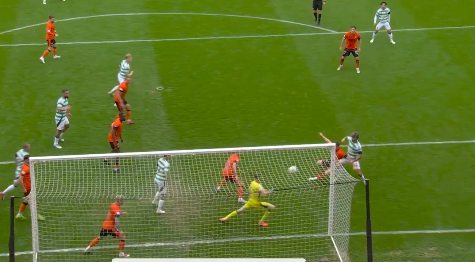 In anticipation of that, Strain stuck his leg out and the ball hit his shin before ending up in the net as Celtic look to get across the line.
