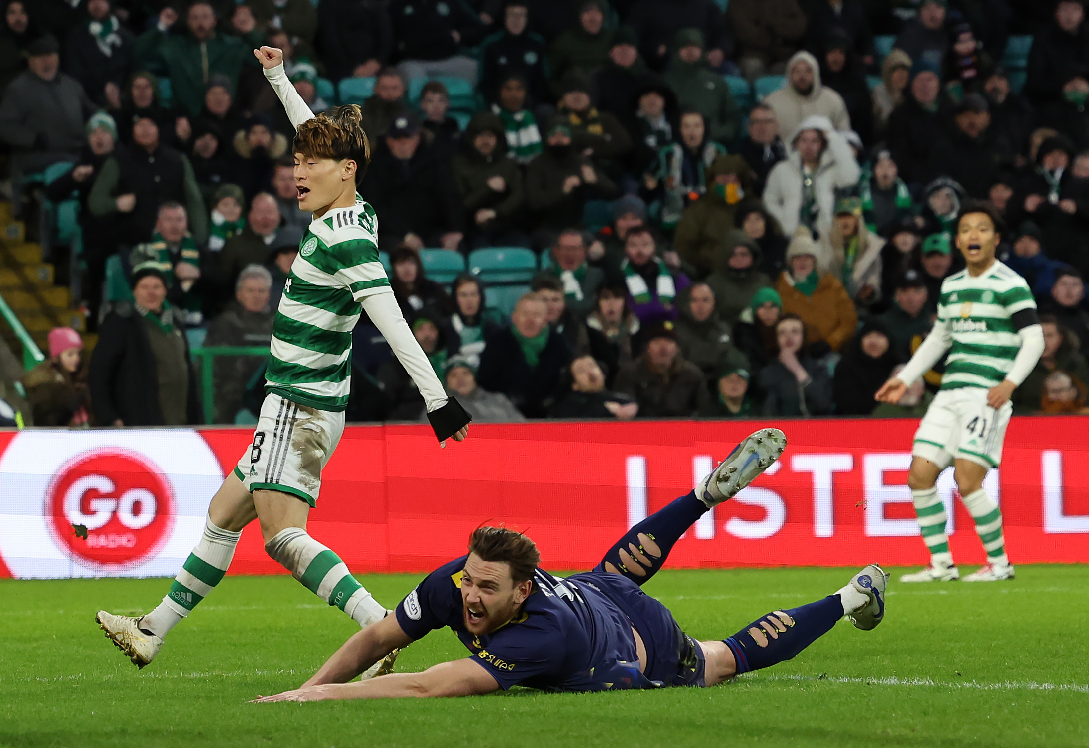 Kyogo Furuhashi of Celtic scores his teams second goal during the Cinch Scottish Premiership match between Celtic FC and Livingston FC at on December 21, 2022. (Photo by Ian MacNicol/Getty Images)