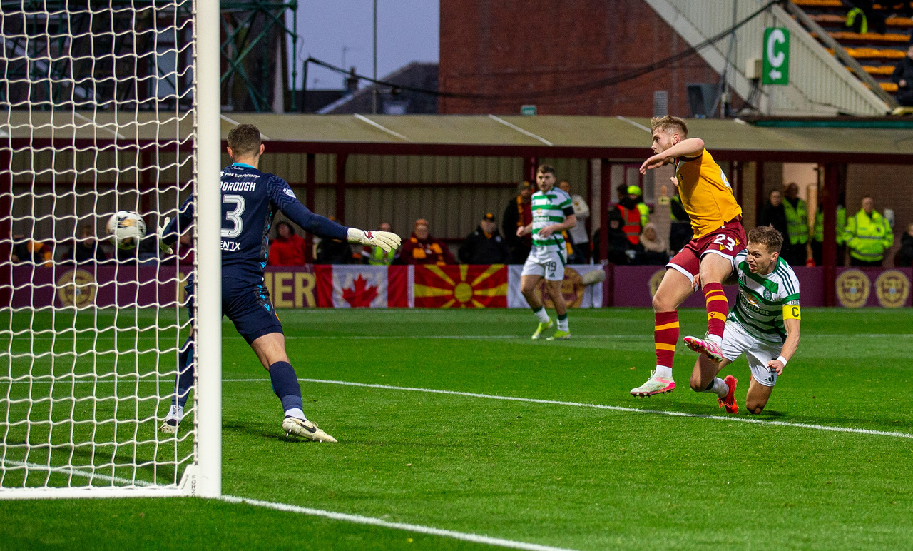 Luke McCowan opens the scoring for Celtic at Fir Park, Motherwell. Photo Vagelis Georgariou for The Celtic Star