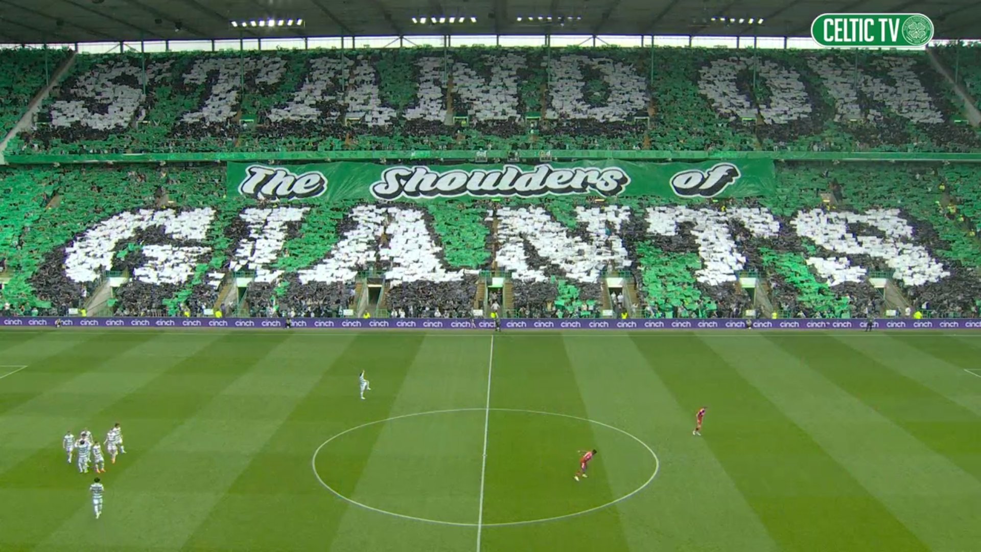 What an incredible stadium wide display from the Green Brigade at Celtic Park today ahead of kick-off as the team’s emerged to this brilliant Stand on the Shoulders of Giants display covering all of Celtic Park with legendary managers Willie Maley and Jock Stein being honoured for their outstanding contributions over many years to the Celtic cause and that is something no doubt that Ange Postecoglou will appreciate.