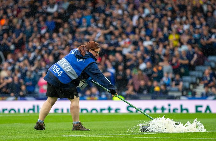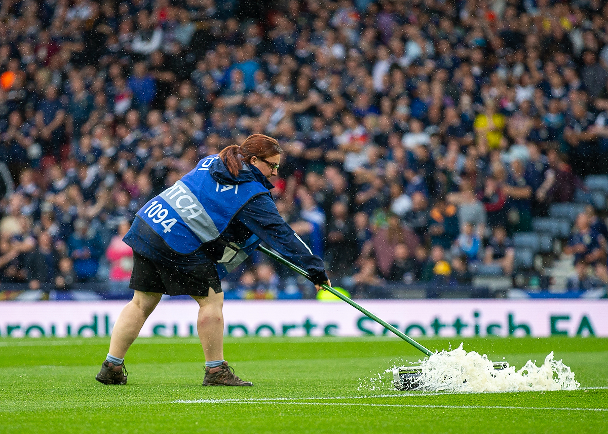 20th June 2023; Hampden Park, Glasgow, Scotland: Euro 2024 Qualifier Football, Scotland versus Georgia; Pitch response ground staff try to clear the water from the pitch