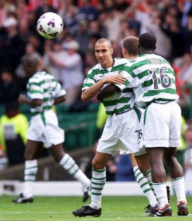 Stiliyan Petrov with Henrik Larsson and Bobo Balde after scoring. Photo by Barrington Coombs
