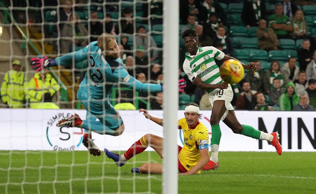 :Vakoun Bayo of Celtic shoots at goal during the League Cup quarter final match between Celtic and Partick Thistle at Celtic Park on 25 September, 2019. (Photo by Ian MacNicol/Getty Images)