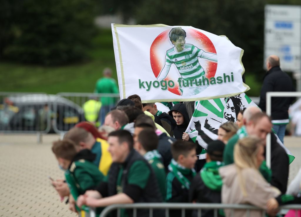 Celtic fans with a Kyogo Furuhashi flag pictured before the Cinch Scottish Premiership match between Celtic FC and Dundee United at on September 25, 2021 in Glasgow, Scotland. (Photo by Ian MacNicol/Getty Images)