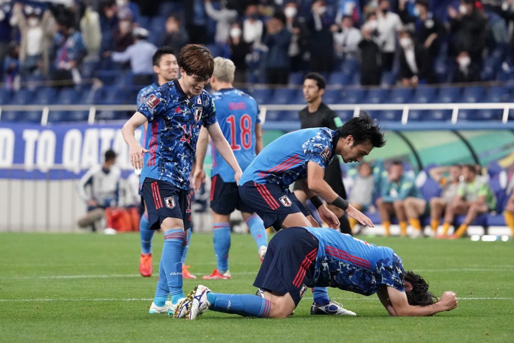 Ao Tanaka of Japan is congratulated by Gaku Shibasaki and Kyogo Furuhashi after his side’s 2-1 victory in the FIFA World Cup Asian qualifier final round Group B match between Japan and Australia at Saitama Stadium on October 12, 2021 in Saitama, Japan. (Photo by Koji Watanabe/Getty Images)