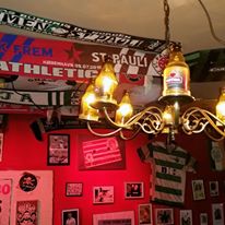 Saturday morning comes and I drag my long-suffering wife onto the various U-trains from our hotel in Freidrichstrasse, in Central Berlin. Up a narrow side street and there it is, the Astra Stube. Inside the bar, the St Pauli boys are already gathering, enjoying a few beers. There are football club colours everywhere, predominantly in the brown, white and red of their favourites, however, I am chuffed to see several Celtic items on display.