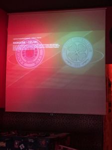 I order a beer at the bar – perfect Marathon prep this will be – and the chap explains that the Celtic match will be shown in what appears to be a snug adjacent to the main area. Inside there is a red velvet two-seater couch, like David and Victoria’s throne, at the opposite end from a pull-down screen. There is no-one else in the snug. A home away from home. Result.