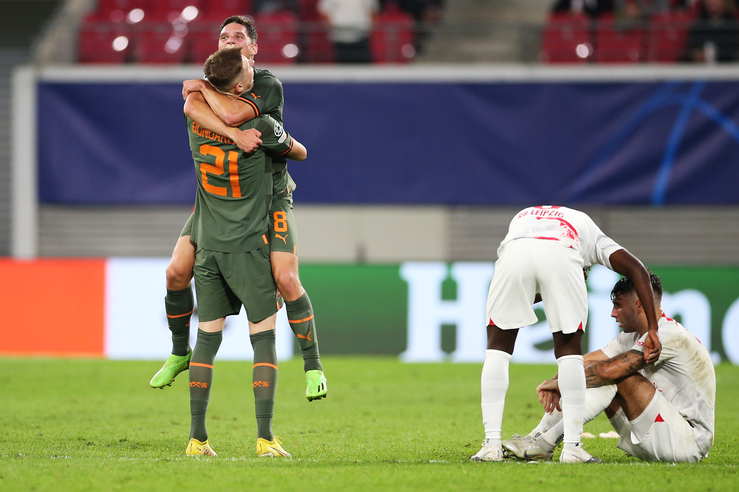 LEIPZIG, GERMANY – SEPTEMBER 06: Heorhiy Sudakov and Artem Bondarenko of Shakhtar Donetsk celebrates victory after the final whistle in the UEFA Champions League group F match between RB Leipzig and Shakhtar Donetsk at Red Bull Arena on September 06, 2022 in Leipzig, Germany. (Photo by Cathrin Mueller/Getty Images)