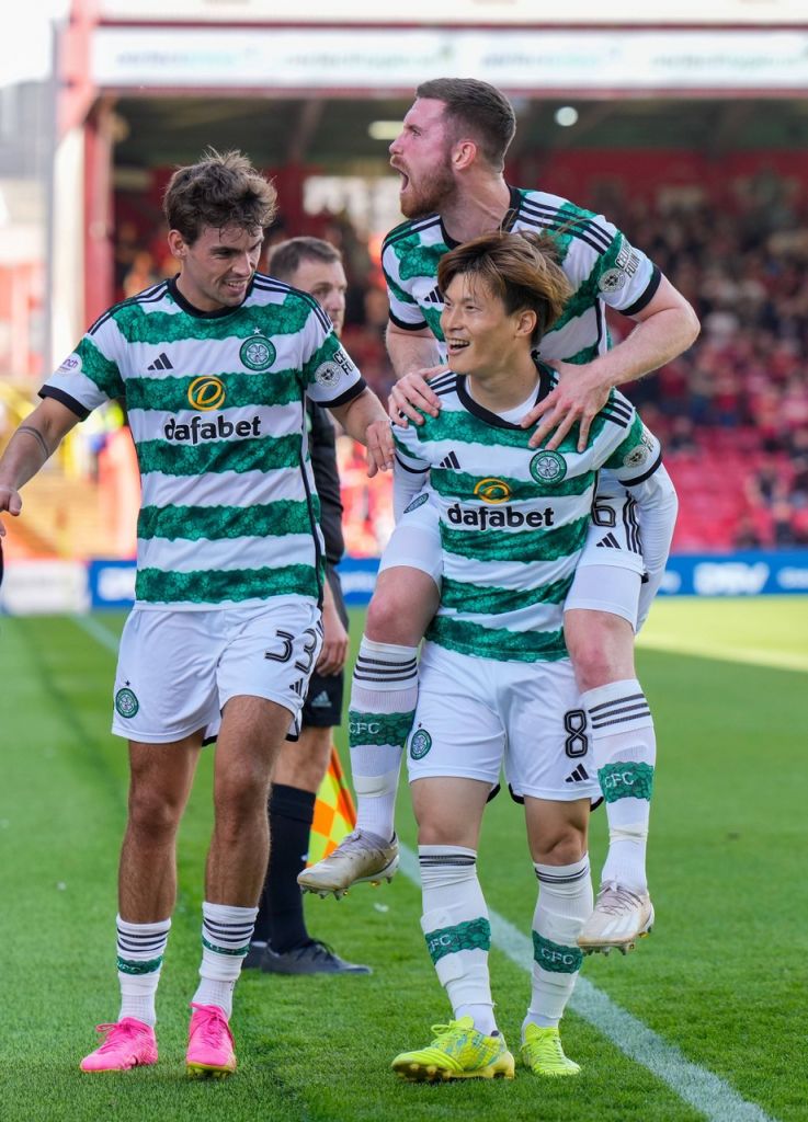 Aberdeen v Celtic – GOAL 1-3 Matt O Reilly scores and celebrates, during the Cinch Scottish Premiership match on 13 August 2023. Photo Stephen Dobson PSI