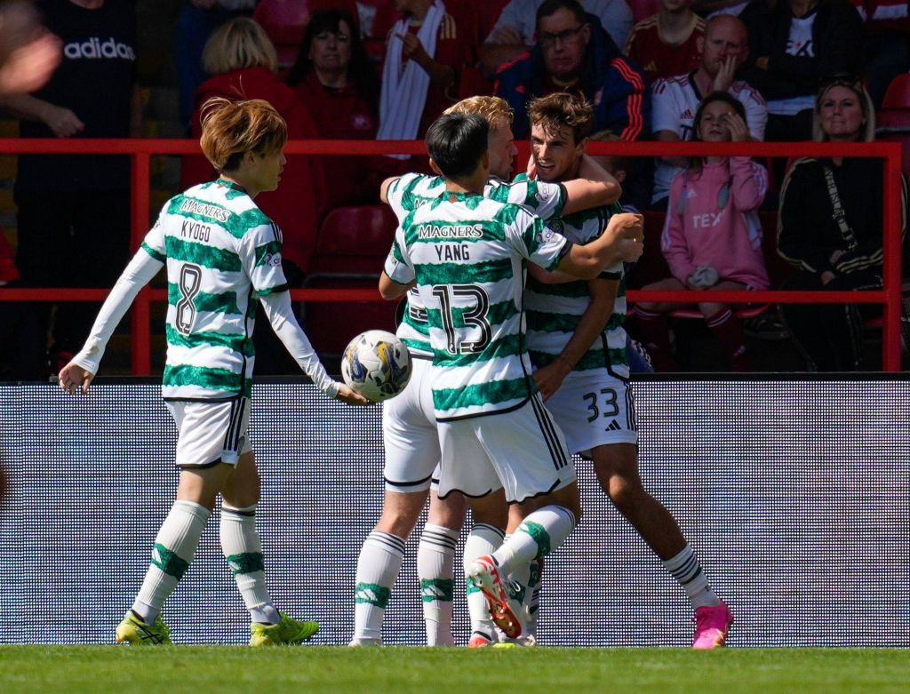 Matt O Riley of Celtic celebrates with team mates after scoring to give Celtic a 1-3 lead. Aberdeen v Celtic, Cinch Scottish Premiership, Football, Pittodrie 13 August 2023 Photo Stuart Wallace/Shutterstock