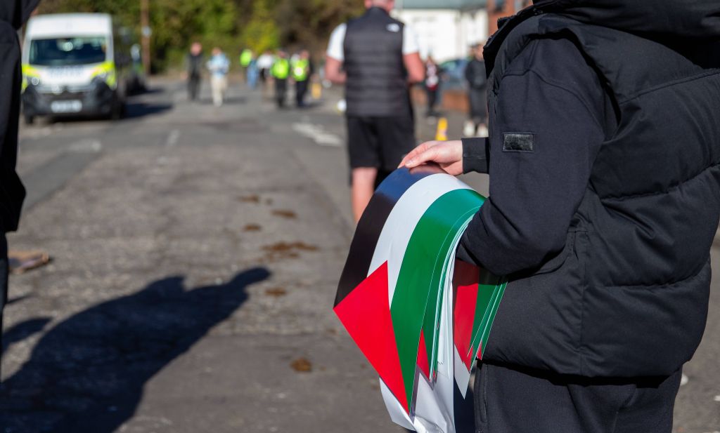 22nd October 2023 Tynecastle Park, Edinburgh, Scotland Scottish Premiership Football, Hearts versus Celtic A Celtic fan holding Palestine flag. Photo Vagelis Georgariou