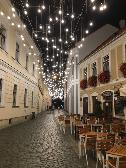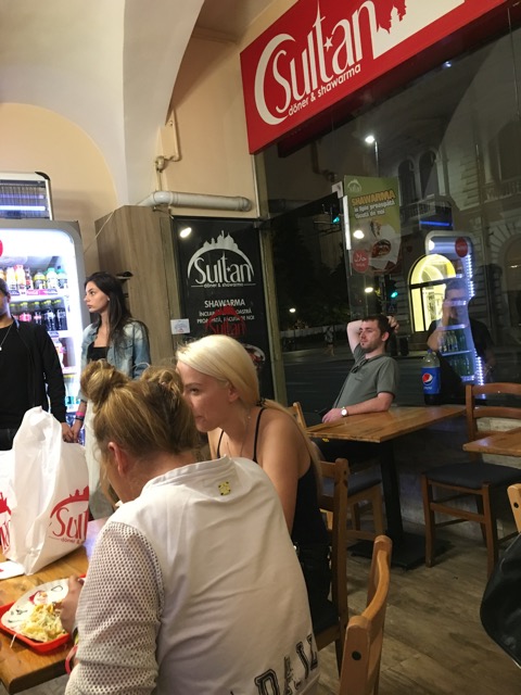 It’s 2am local time and that will do it for me. I head out into the street and it is a complete contrast to earlier, now deserted and beautifully lit up, another classic photo op. Around the corner, there is a sign saying ‘Street Food’ outside a crowded shop. My son often talks of street food and I’m down with the kids after umpteen pints of Guinness and a Palinca, so I’m in there.